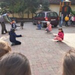 Elméleti rész után, amiben a gyermekek remekeltek, egy látványos bemutató következett. A kutyusok bemutatták, a diákok segítségével, hogy mit is tudnak, hogyan kerülnek ki akadályokat, hullahopp karikákon hogyan ugranak át, tanulók és tanárok lába alatt, hogyan kúsznak. A sok, lelkes gyermek ellenére sem figyeltek a gyerekbarát kutyusok a gazdájukon kívül másra.