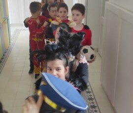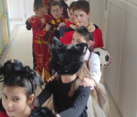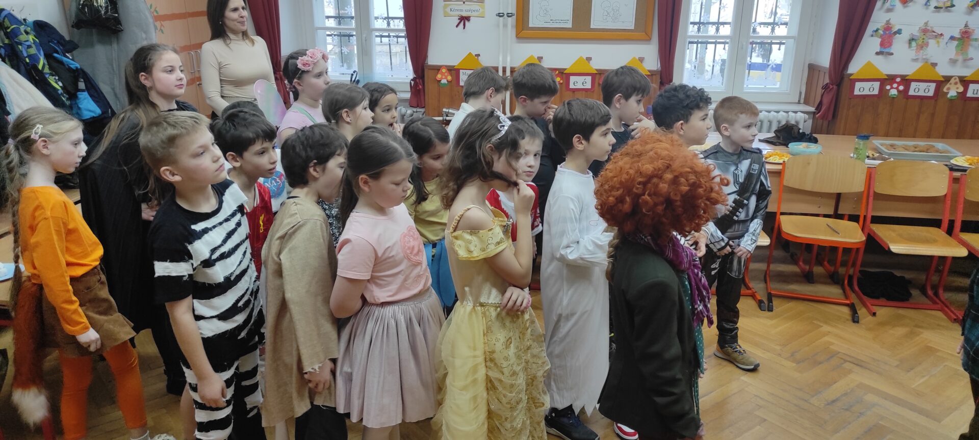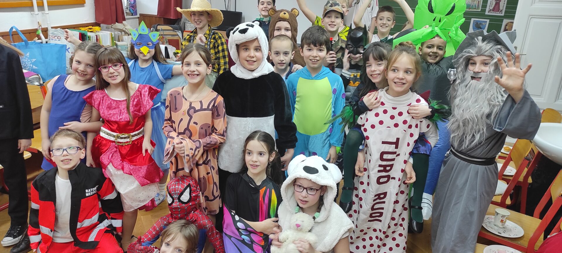 Iskolánk legkisebbjei nagy izgalommal várták farsang napját. Az alsós közösség apraja-nagyja tarka díszbe öltöztette iskolánk termeit: álarcok, bohócok, szerpentinek jelezték a nagy nap közeledtét.